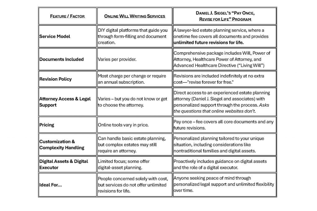 Daniel J. Siegel’s  “Pay Once, Revise for Life Estate Planning Program program provides comprehensive, attorney-guided planning with transparent flat fees.  We don’t want the pressure of fees to prevent you from planning for the future. Through our comprehensive interview process, we try to take some of the stress away from this delicate time. We understand that these are often emotional decisions so we work closely with you to ensure that your estate will be properly structured.